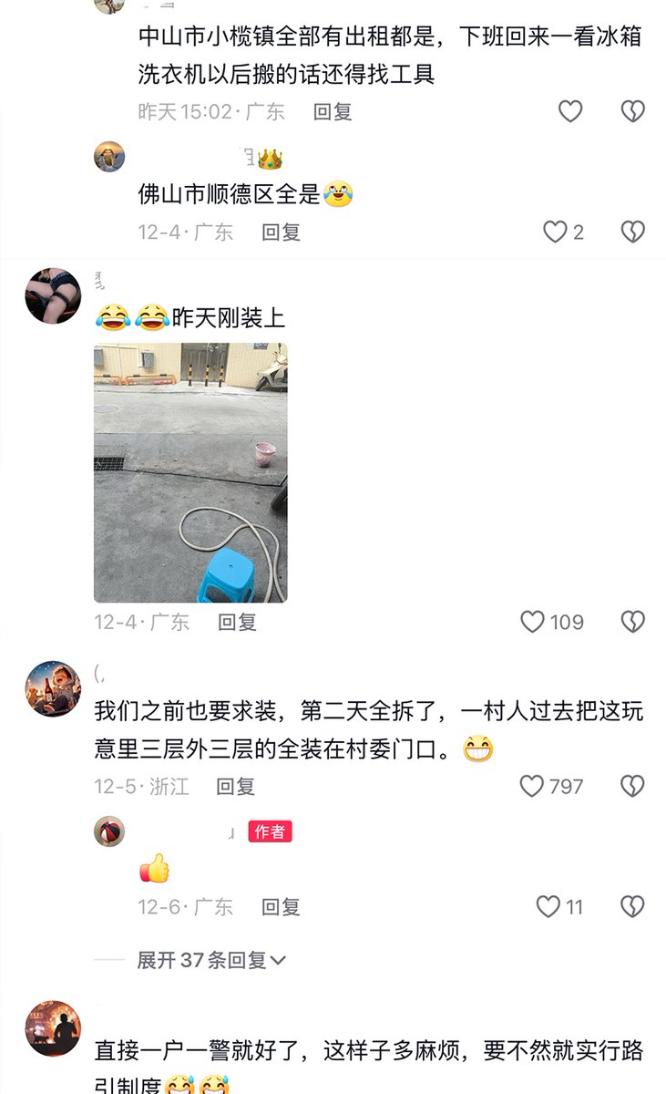 12月4日,广东中山,网友发视频称,村委强制要求门口安装隔离柱,否则断电。 评论区的网友反映除了中山市,佛山顺德区也要安装。