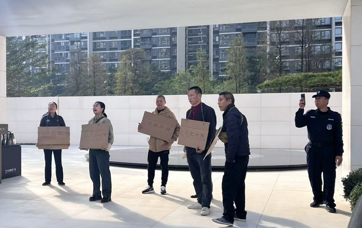 12月13日,广东省佛山市顺德区华润置地广场,工人们挂牌讨薪。
