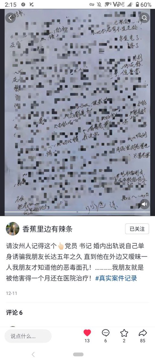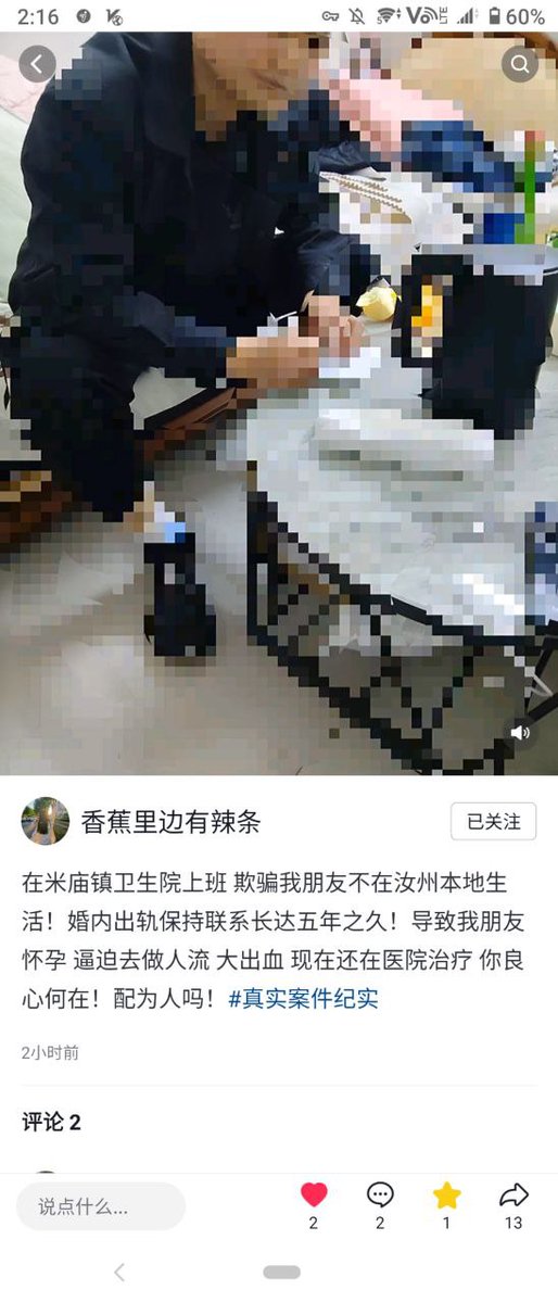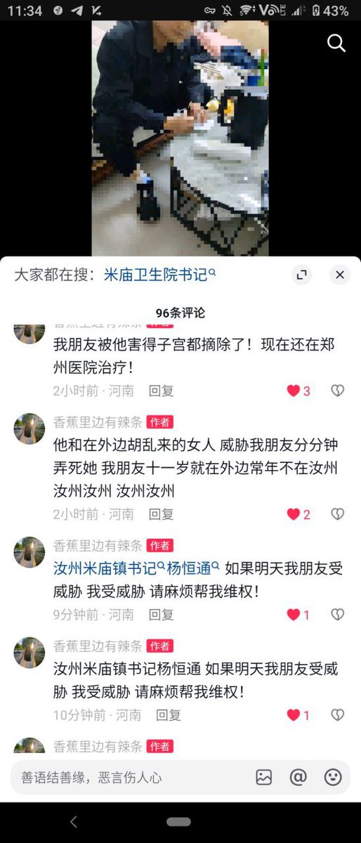 12月11日 河南省汝州市 女生举报镇卫生院党支部书记杨恒通婚内出轨 隐瞒他已婚事实,声称他单身并与受害者确立关系,致其怀孕,又逼迫其人流致大出血,导致子宫拆除。后又殴打受害者,逼迫分手,并威胁受害者:他上面有人,分分钟弄死受害者受害者朋友称之前去过数次派出所都没用,遂在抖音发声维权