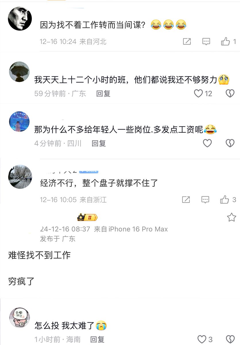 12月16日报道,无业人员宋某,因经济困难,萌生出投敌换钱想法,他将某科研单位的公开信息整理打包,并登录境外谍报机关网站希望与对方合作,被国安机关处罚。 网友回复“经济不行,整个盘子都撑不住了” “那为什么不多给年轻人一些岗位,多发些工资呢?” “怎么投,我现在太难了”