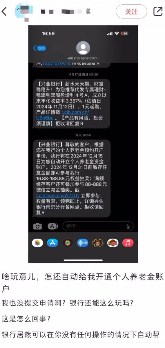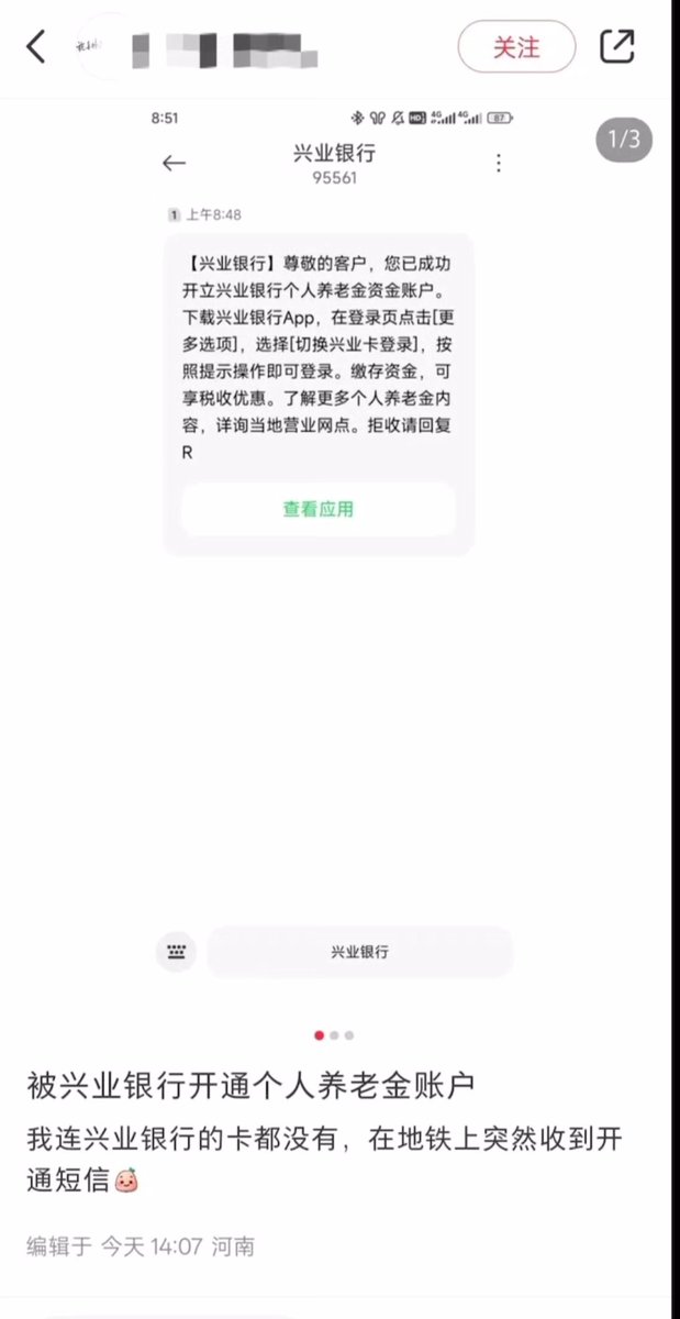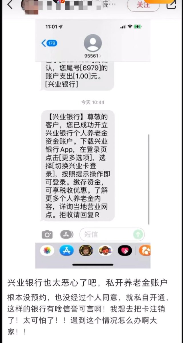 中国当局宣布个人养老金制度即将全国推行后,近日有网友在社媒反映,兴业银行在用户不知情的情况下,私自给用户开启个人养老金账户。
