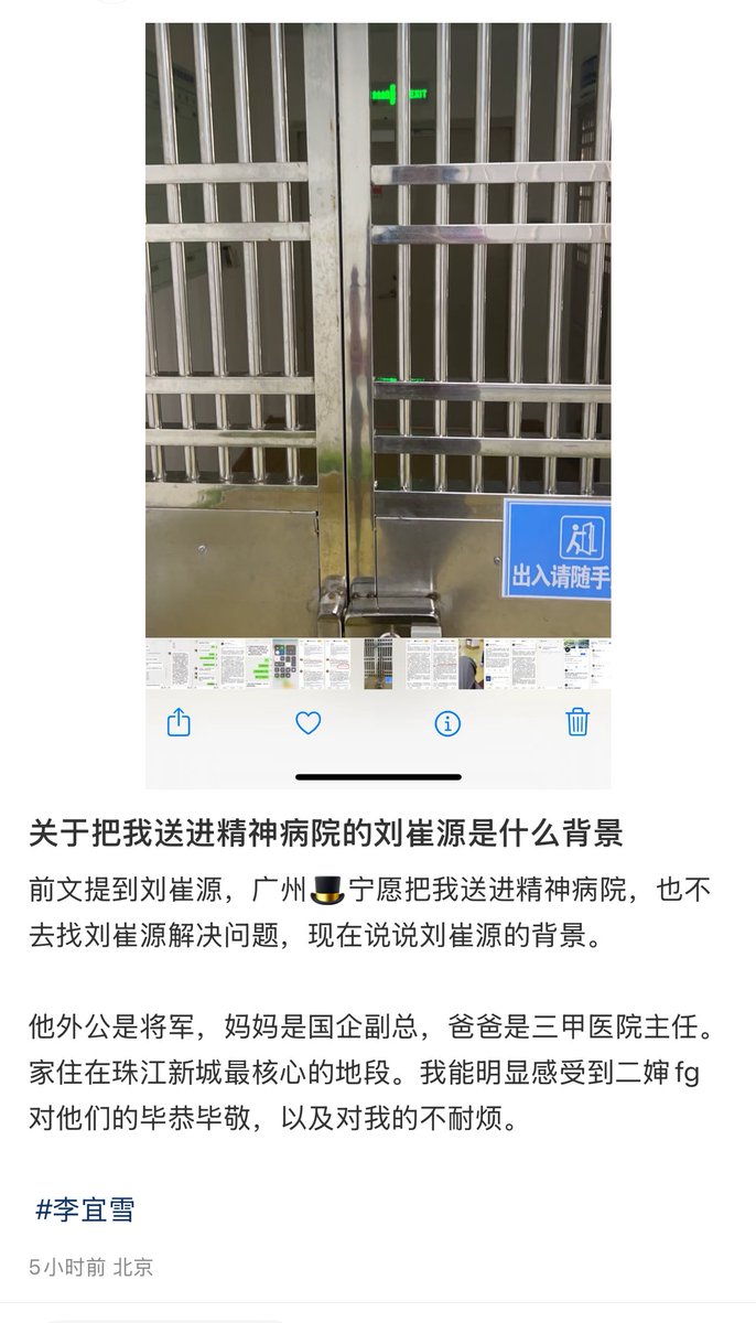 近日,一名女子自述被男友欺骗感情后,因维权被强制送进精神病院。 12月17日,女子再次发文,称男方的外公是将军、母亲是国企副总、父亲是三甲医院主任。并且男方家住珠江新城最核心的地段。