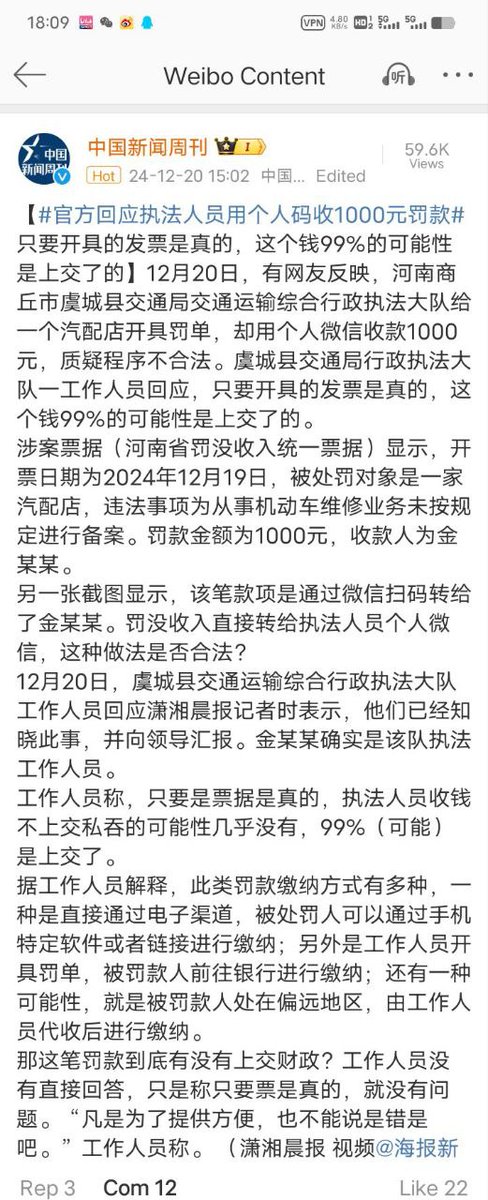 12月20日 河南虞城县交通局执法人员因汽修店修车没有备案,对其开具罚单,并用个人收款码收1000罚款引发质疑。交通局回应:只要开的发票是真的,这个钱99%的可能是上交了当被问及这笔罚款到底有没有上交财政时,工作人员没有直接回答评论区网友则问道:99%,那1%呢?应该是政府没钱了,罚款代替工资
