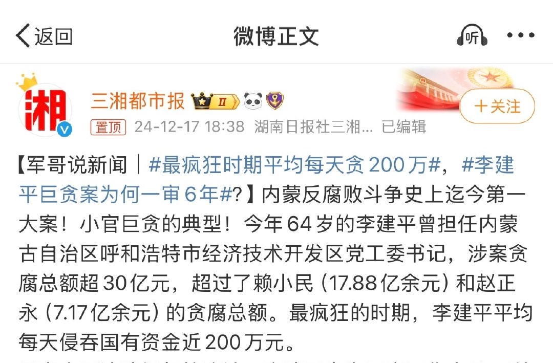 12月17日,微博热搜榜单:“最疯狂时期平均每天贪200万” “曝西安环卫工被拖欠5个月工资堵路要钱”
