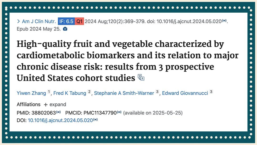 此外,摄入更多的这些高代谢质量蔬菜水果,与降低慢性病风险相关。然而,如果摄入更多的中等或低代谢质量蔬菜水果,与慢性病风险降低无关,甚至还会让糖尿病风险增加13%。