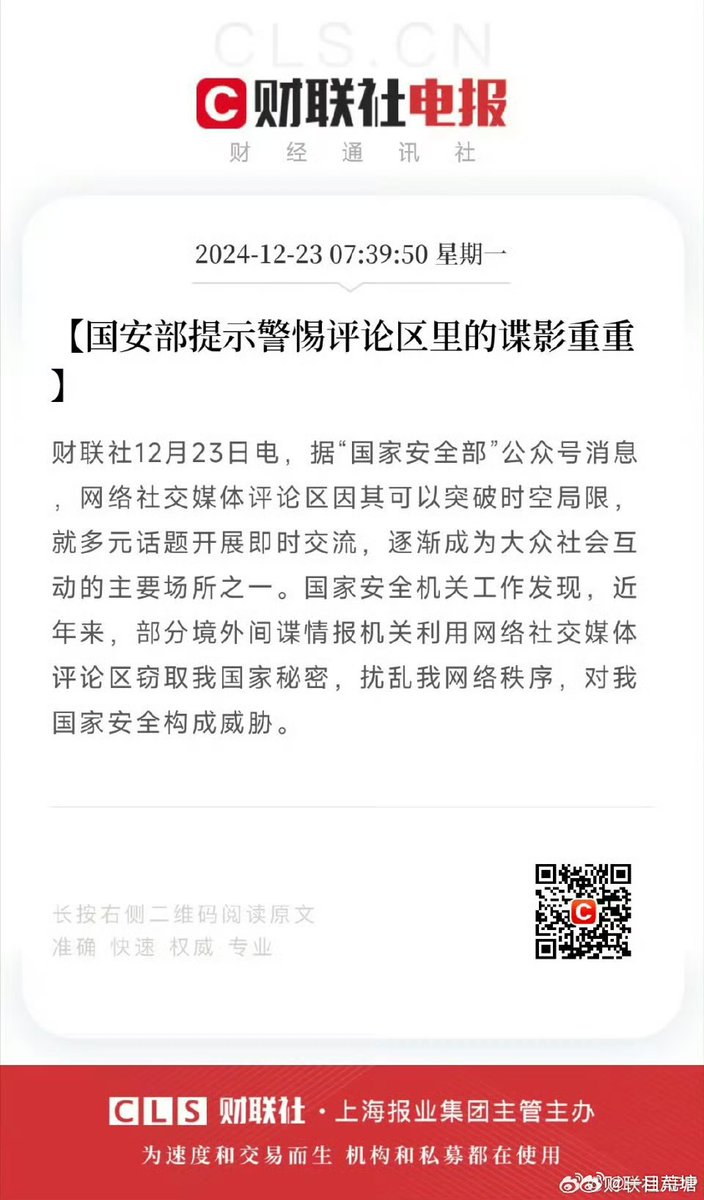 12月23日报道,国安部提示:警惕评论区里的谍影重重。 国家安全机关发现,近年来,部分境外间谍情报机关利用网络社交媒体评论区窃取我国秘密,扰乱网络秩序,对我国家安全构成威胁。