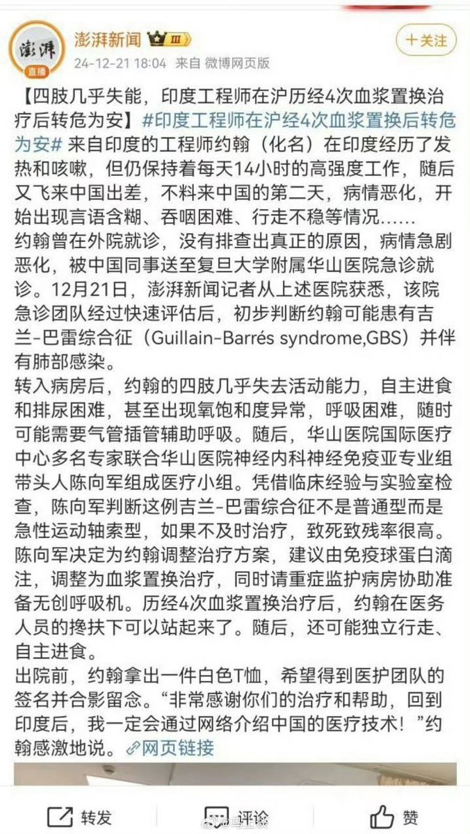 12月21日 澎湃新闻发布新闻:印度工程师在华突发疾病,复旦大学华山医院组织多个专家的治疗小组,帮其进行4次血浆置换后转危为安,全体医护合影留念该报道引发网友众怒,目前澎湃新闻已删除该报道