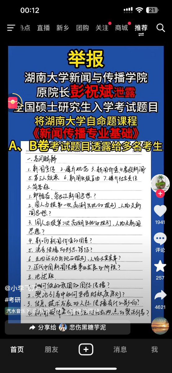 近日 有网友在小红书举报湖南大学原院长彭祝斌泄露全国硕士研究生入学考试题目举报人称:彭祝斌将湖南大学自主命题课程《新闻传播专业基础》的A、B卷考试题目在考前透露给多名考生,帮助他们作弊考研作弊目前已入刑,组织作弊处3年以下有期徒刑目前该篇帖子先是被小红书禁止评论,后又被小红书删除