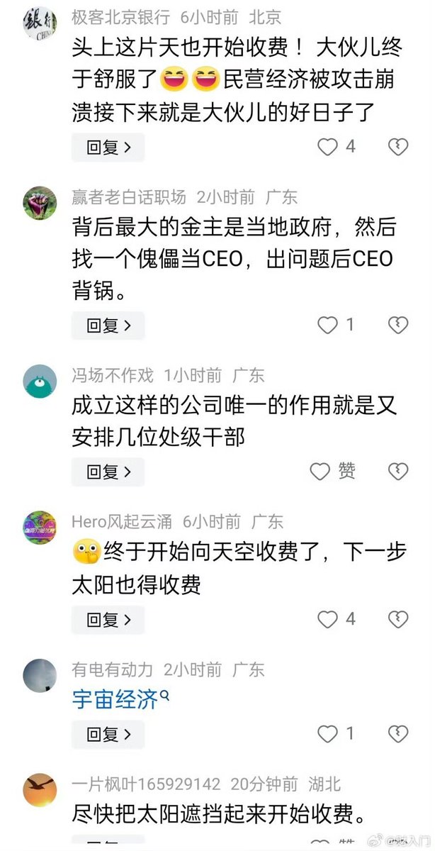 当地卖不动后,地方政府又打起了天的主意。 近日,湖南省低空经济公司成立,注册资本20亿。 网友回复“终于开始向天空收费了,下一步太阳也得收费”