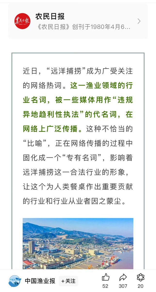 12月27日,农民日报为“远洋捕捞”正名:这一渔业领域的行业名词,被一些媒体用作“违规异地趋利性执法”的代名词,在网络上广泛传播,这种不恰当的比喻,影响远洋捕捞这一合法行业的形象。