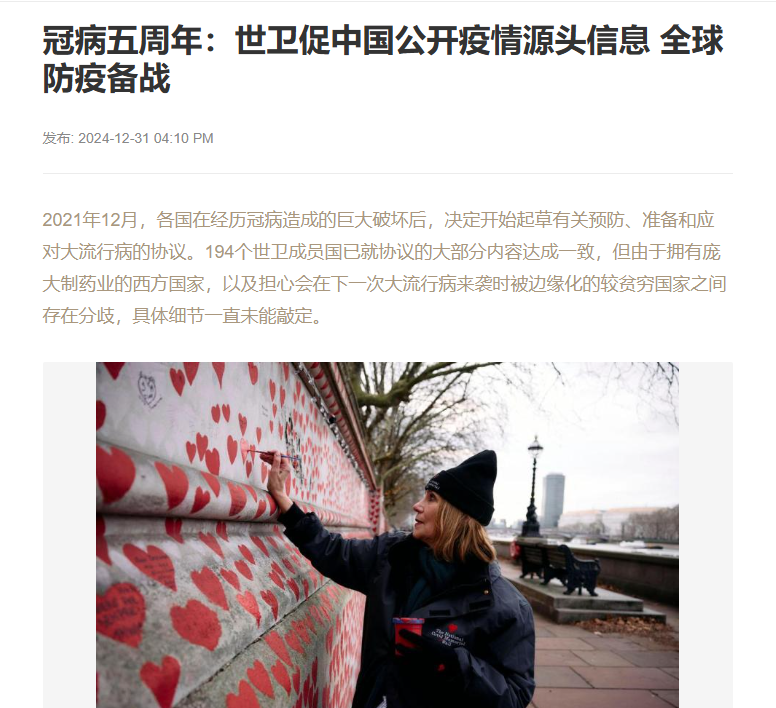 世卫组织继续敦促中国在五年后分享Covid-19起源数据,世卫组织表示:“这是道德和科学的当务之急。如果各国之间不透明、不共享、不合作,世界就无法充分预防和应对未来的流行病和大流行病。” 中国外交部回应:中国已在国际社会分享了最多的 COVID-19 数据和研究成果,中国也是唯一组织专家多次与世卫组织分享溯源进展的国家。