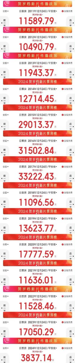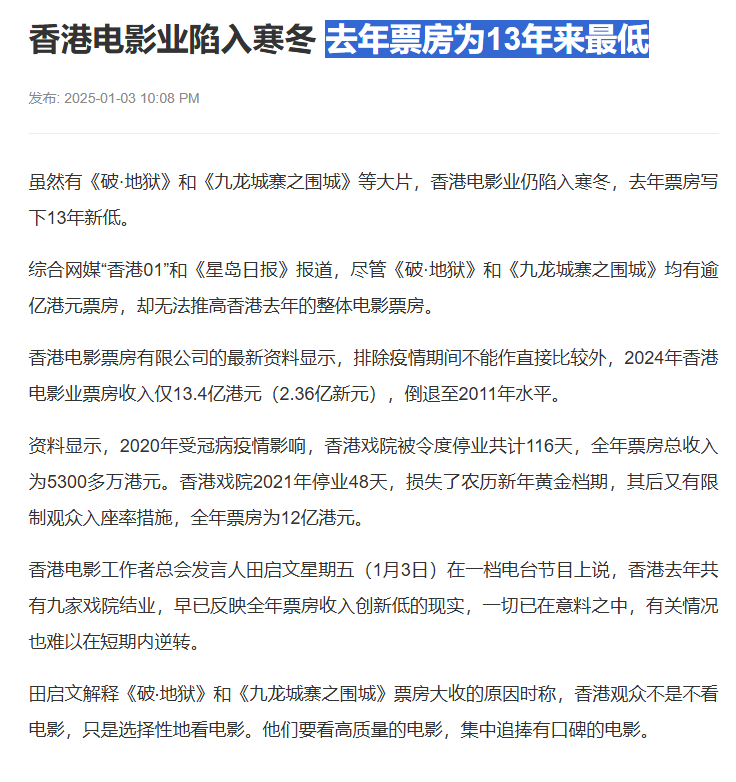2024年中国内地平安夜电影票房表现不佳,仅有3837.14万,创近十年来新低。 而香港的电影票房数据也同样不容乐观,据报道,香港电影业陷入寒冬,不计算2020年和2021年疫情期间,2024年香港电影票房收入仅13.14亿港元,比2023年下跌了6.2% 为13年来最低,收入倒退至2011年。