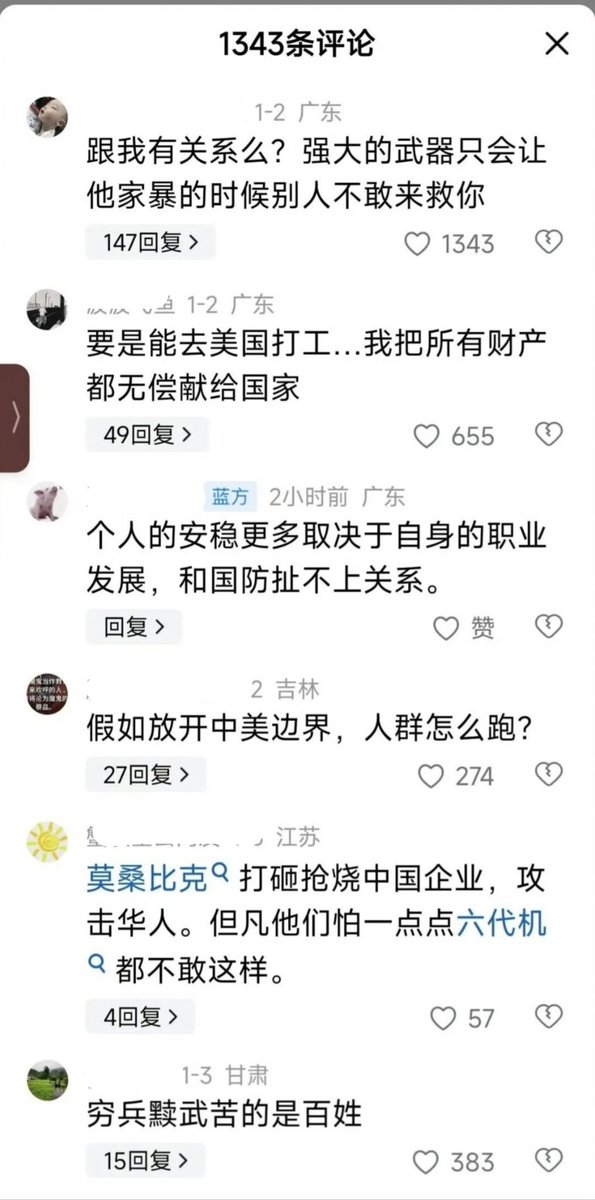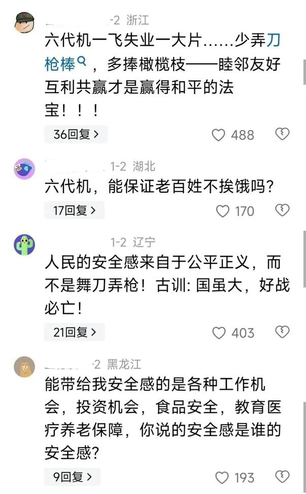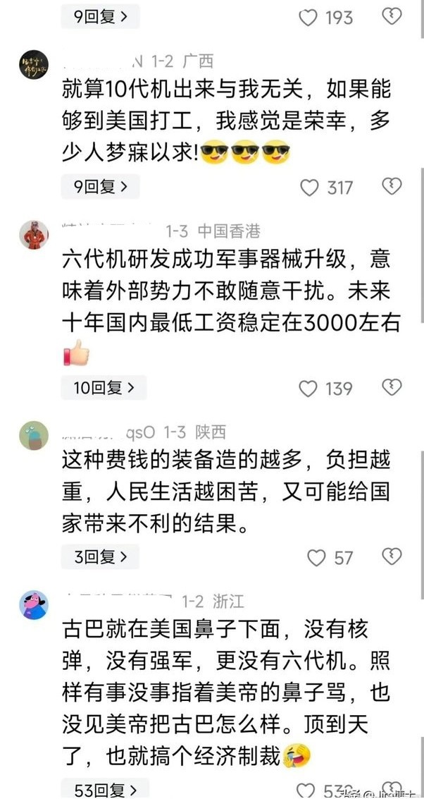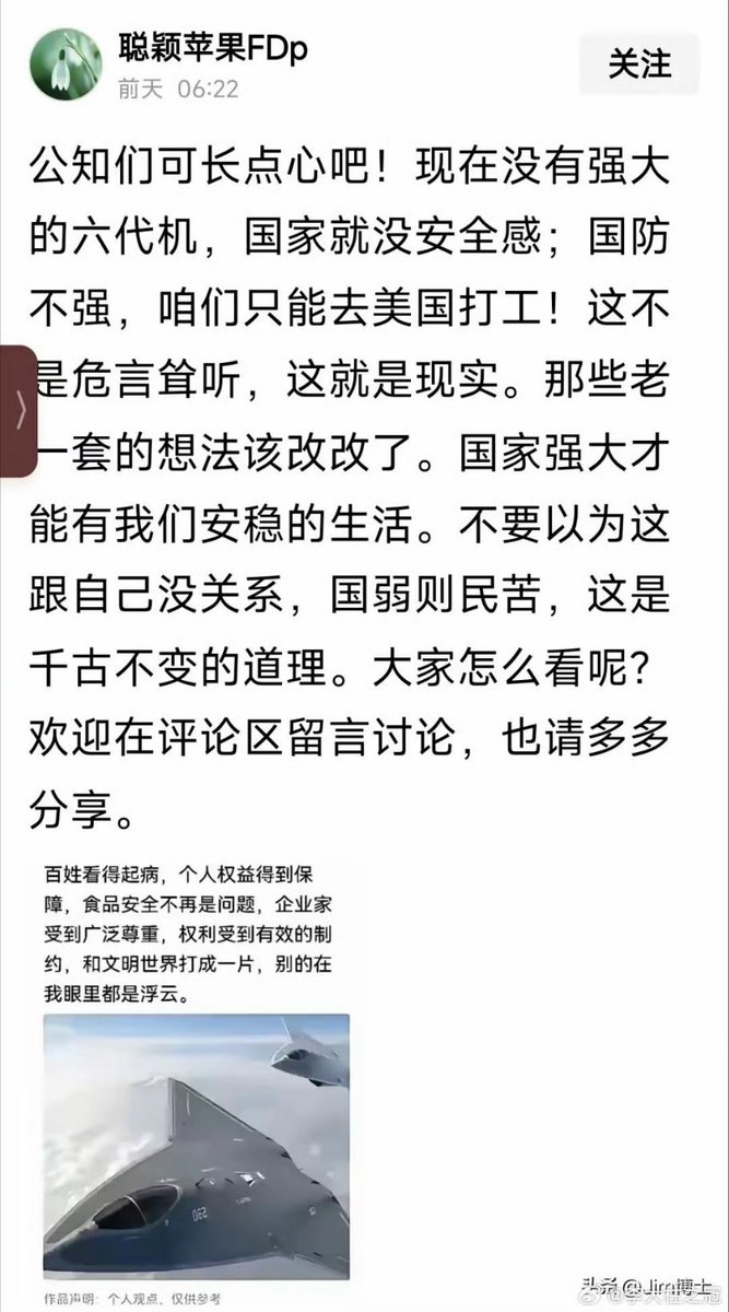 近日,一博主发文称,公知们长点心吧,没有强大的六代战机,国家就没有安全感,国防不强,咋们只能去美国打工。只有国家强大了才能有我们安稳的生活。 网友们纷纷在评论区表示:六代机出来和我有什么关系?“六代机能保证老百姓不挨饿吗?”