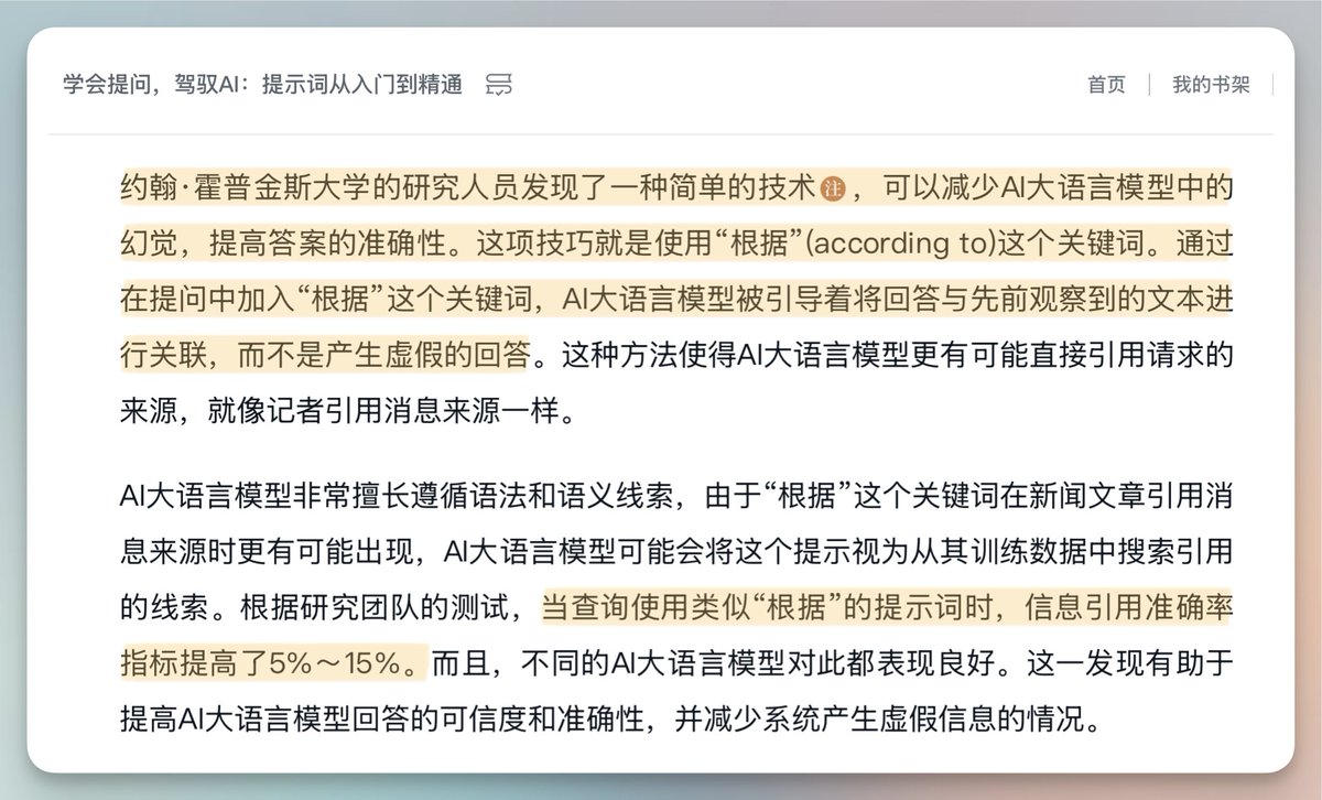 一个减少大模型幻觉、提升准确度的小技巧,提问时加上“根据”这个关键词。例如:根据维基百科,介绍鸟和恐龙的关系。是不是“基于”也有效?