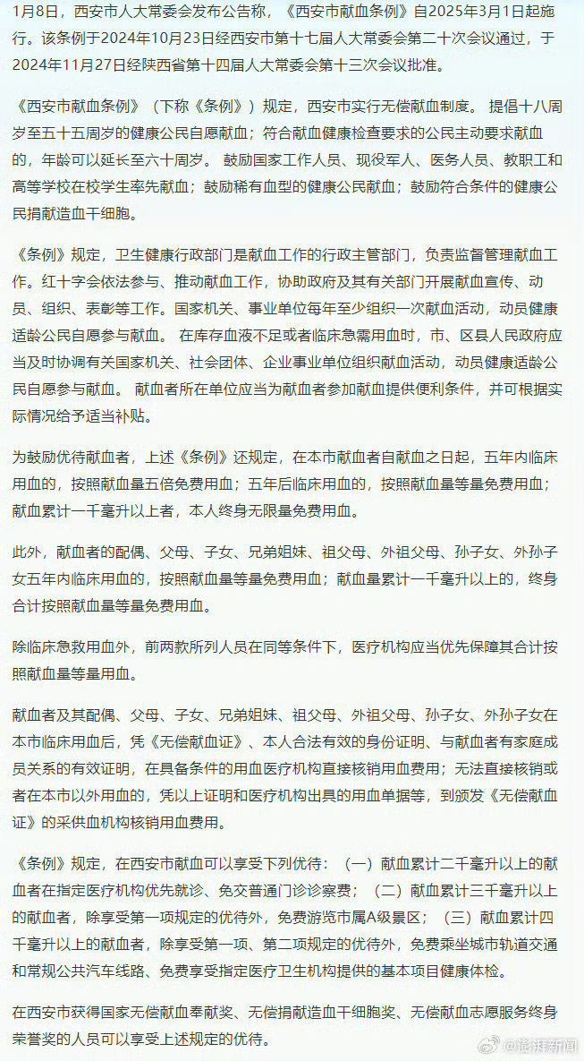 1月8日 西安公布献血条例:献血累计超一千毫升,可终身无限量免费用血评论区网友则纷纷表示不信:“信用崩塌”“中国人不骗中国人”知乎上也曾出现过多次相关讨论:“异地献血证不认”“半年以上献血证不认”“没有新献血证不让用血”甚至出现过献血证贩子这个职业,家属需要买近期献血证才能在手术中用血