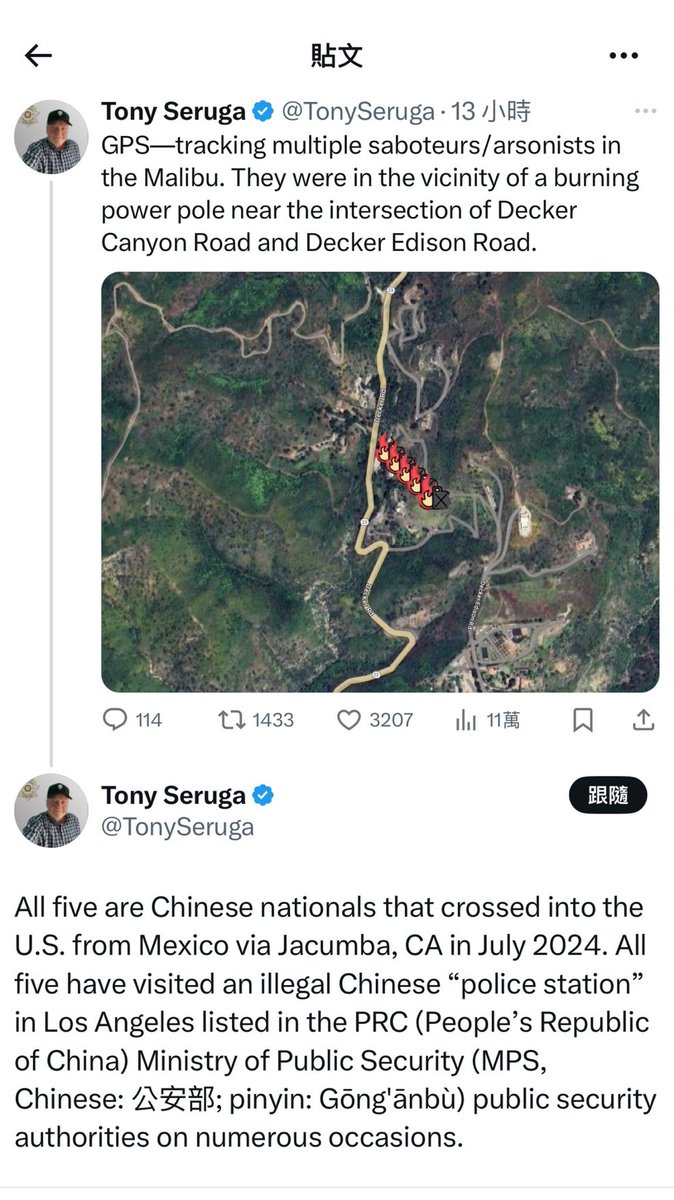 🔥🔥🔥又是一条惊掉下巴的消息,虽意料之中却不得不再次感慨,中共果然是坏事做绝啊!这条消息显示:GPS 追踪加州马里布的纵火犯。五人都是中共国公民,于 2024 年 7 月从墨西哥经加利福尼亚州Jacumba入境美国。 这五人都曾经去过洛杉矶的一个属于中共国安的中国 "派出所"‼️‼️期待实锤!
