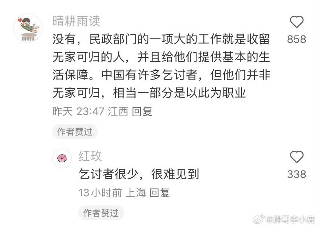 网友:年纪大点的都知道,中国行乞的突然少了那么多,是因为影响市容市貌影响创文创卫,撵回村里了。而不是像小红书网友说的那样,仿佛他们活在平行宇宙里。