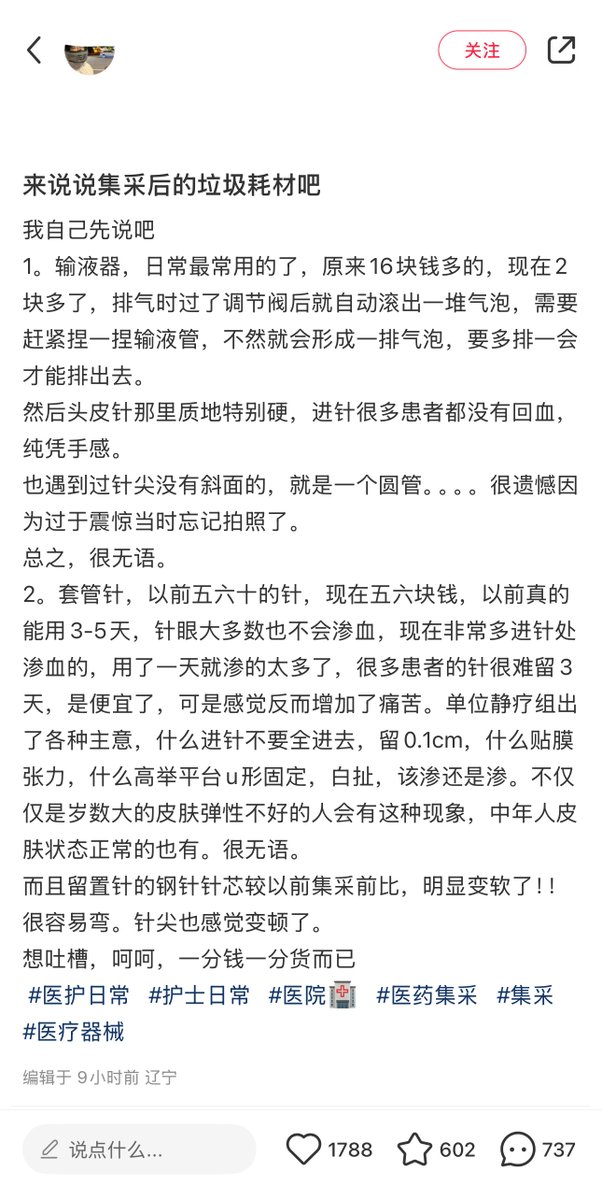 1月19日,辽宁。一名医护人员吐槽医保集采后耗材质量差的问题。