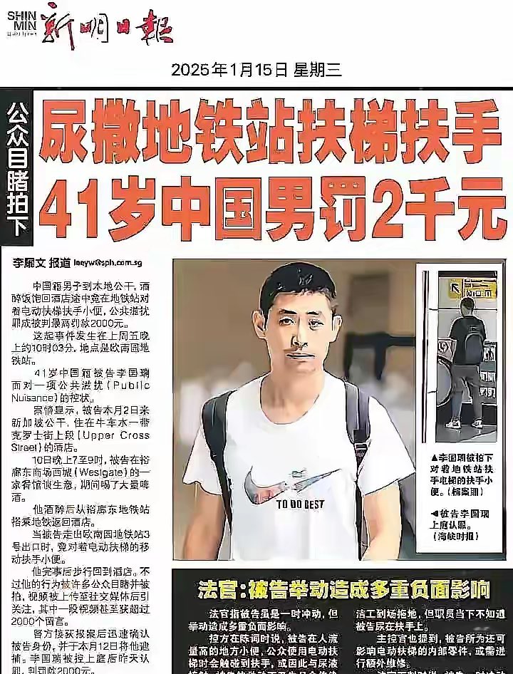 这哥们在新加坡地铁上尿尿被抓,罚了2000新元(约人民币一万多),结果他的照片直接上了头版,