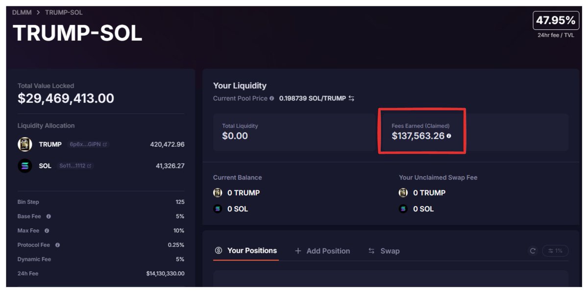 昨日复盘小收获✨七小时 Meteora 的 TRUMP/SOL 池子 LP 手续费收入 13.7 万刀 —— 由于选的是「Bid Ask」模式,主流动性池在 TRUMP 迅速下跌时流动性不足,为了稳一手设置的 5%手续费池反而爽吃了一波可惜赚的还没有大盘回撤的现货浮亏多🥹