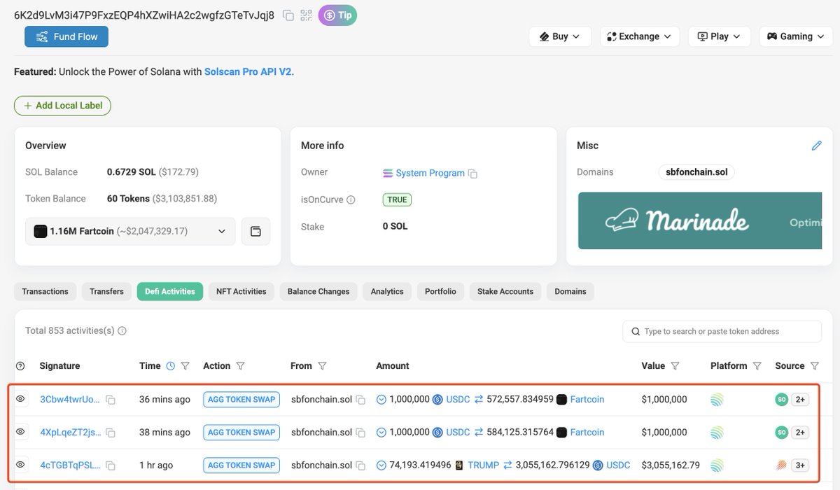 巨鲸们都转战 AI Meme 了是吧🤪Ansem 前脚刚买入 100 万刀的 FARTCOIN,巨鲸sbfonchain.sol 也清仓了 305 万美金的 $TRUMP 转头加仓了 200 万美金的 $FARTCOIN,成本 $1.73他在 TRUMP 上累计亏损了 20.4 万美金,在 FARTCOIN 上的累计利润却高达 226 万美金,回归本心了属于是哈哈