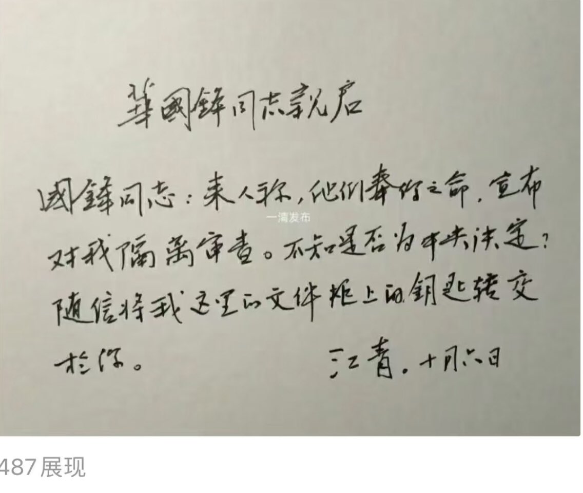 江青被抓前留给华国锋的字条。从字上看这家伙有一把刷子,还蛮硬的。