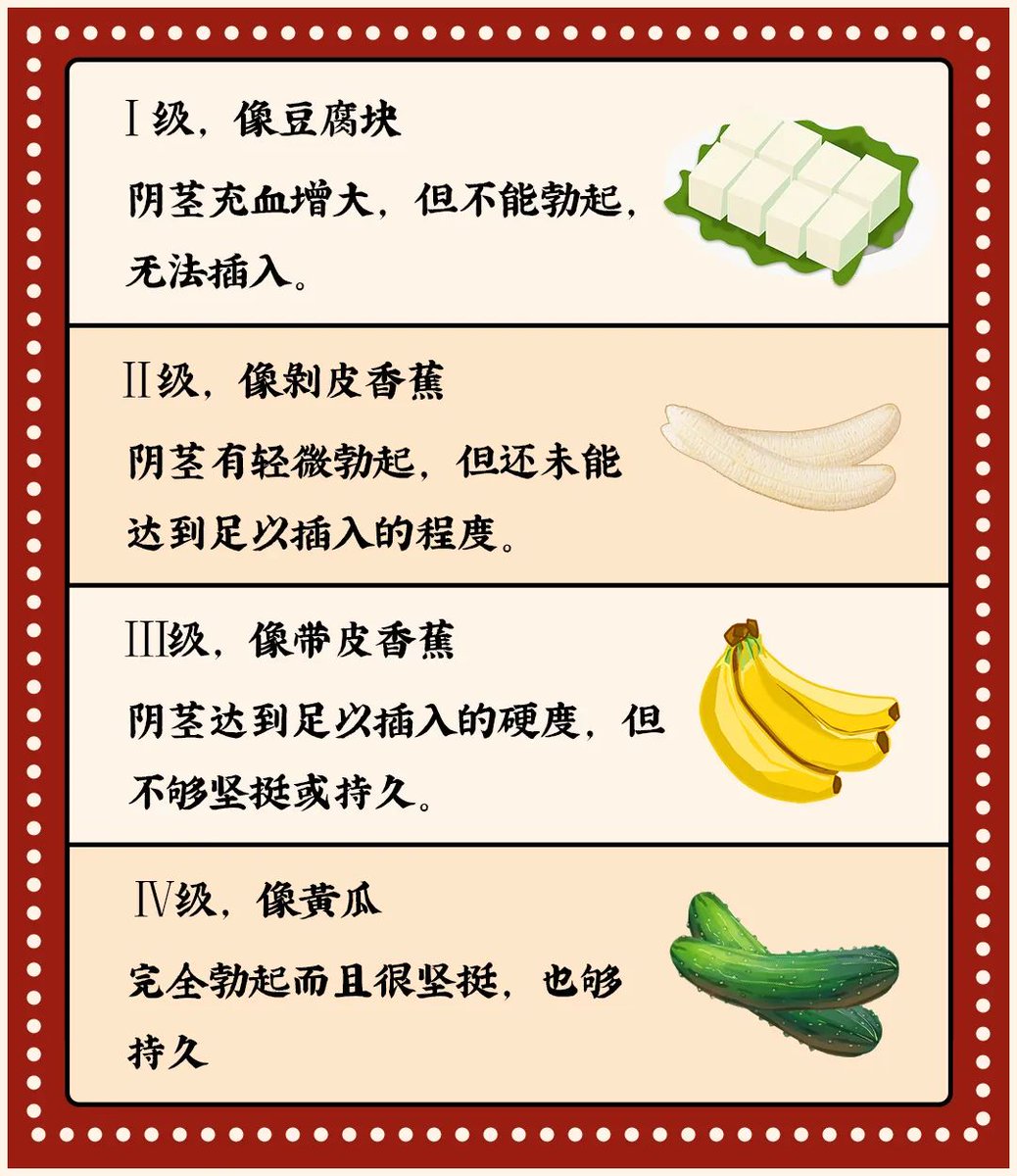 究竟一次性生活时间多久合格,一周几次性生活才合理? 唯一正确的答案,可能只有你自己才知道!。 但从大数据来看,中国平均性生活的时间5分钟左右,一周2-3次,但个体差异较大。 “高质量性生活”的标准,有一个相对公认的指标,就是硬度,一切都不及硬度重要。 一般来说,四级硬度可以有效地让性福时间更加坚挺。 医学上把勃起硬度分为了4级,你可以对照一下。
