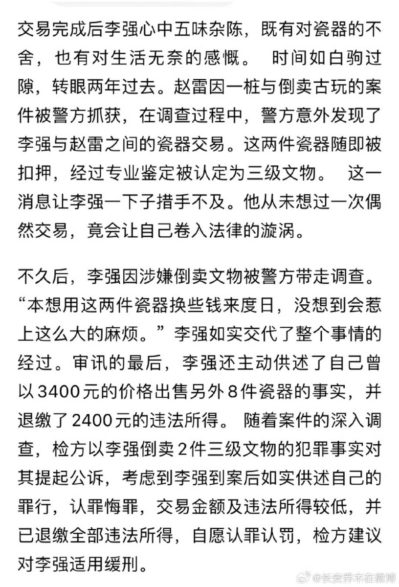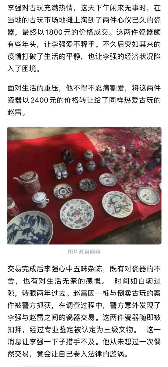 贵州广电:来自江西的李强在古玩市场花1800元捡漏两件瓷器,疫情期间因经济困难于是转售。结果因瓷器是三级文物,检方以强制倒卖三级文物的犯罪事实对其提起公诉。 律师:文物是宝贵财富,法律红线不可触碰。