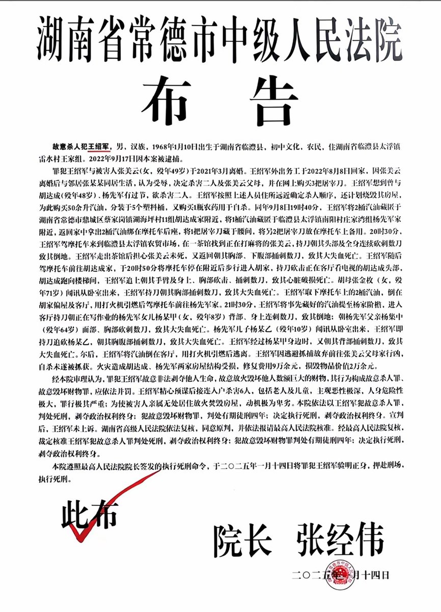 湖南一名男子离婚后持刀砍杀6人,包括老人及儿童,于近日押赴刑场执行死刑。 湖南常德中级法院布告显示,王昭军2021年和张美云离婚,同年将张美云杀死后,王昭军想到曾与胡达成、杨先军有矛盾,于是又将胡达成及其老母亲砍死,接着又前往杨先军家中,将其8岁女儿、10岁儿子、46岁父亲统统杀害。