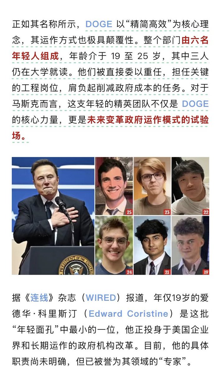 马斯克的DOGE部门由六名19-25岁年轻人构成,外界把他们宣传成精英中的精英。这些年轻人个个是天才级别的专家,但是资历太浅,对政治一知半解,马斯克要让他们来主导政府效率改革。我们这个时代的保守派改革比自诩进步的自由派改革更加激进,进步派光关心身份政治和移民问题了,保守派想搞社会实验。