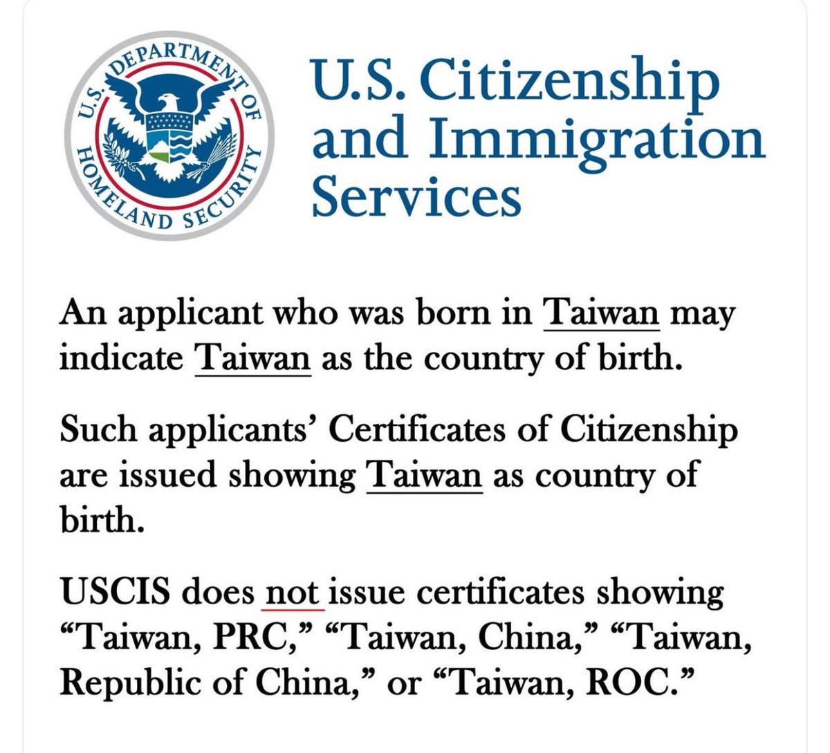 USCIS发表声明,认定台湾就是台湾,不需要写台湾 PRC,台湾中国,台湾中华民国或者台湾 ROC