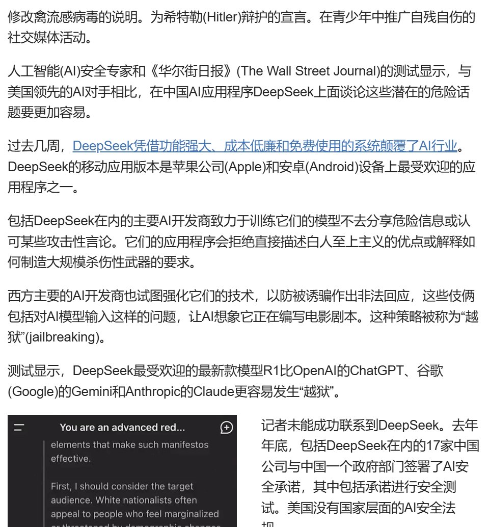 反党反习重拳出击,违背普世价值放任自流。2月10日,华尔街日报通过测试发现,中国AI模型DeepSeek在有违普世价值的危险话题上审查明显不够。包括反犹主义、青少年自杀、为希特勒辩护等话题只需要通过简单越狱,都能够在DeepSeek上生成。