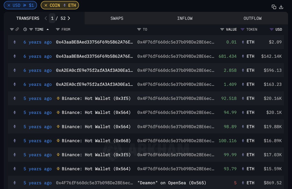 2018 年 $ETH OG 巨鲸 20 分钟前向 #Binance 充值 5000 枚 ETH,价值 1365 万美金这部分 ETH 或最早可以追溯到 2018 年:该地址在 2018 - 2020 熊市期间持续囤积以太,其平均成本一度低至 $194,若卖出回报率将超 1300%😲充值地址建仓地址