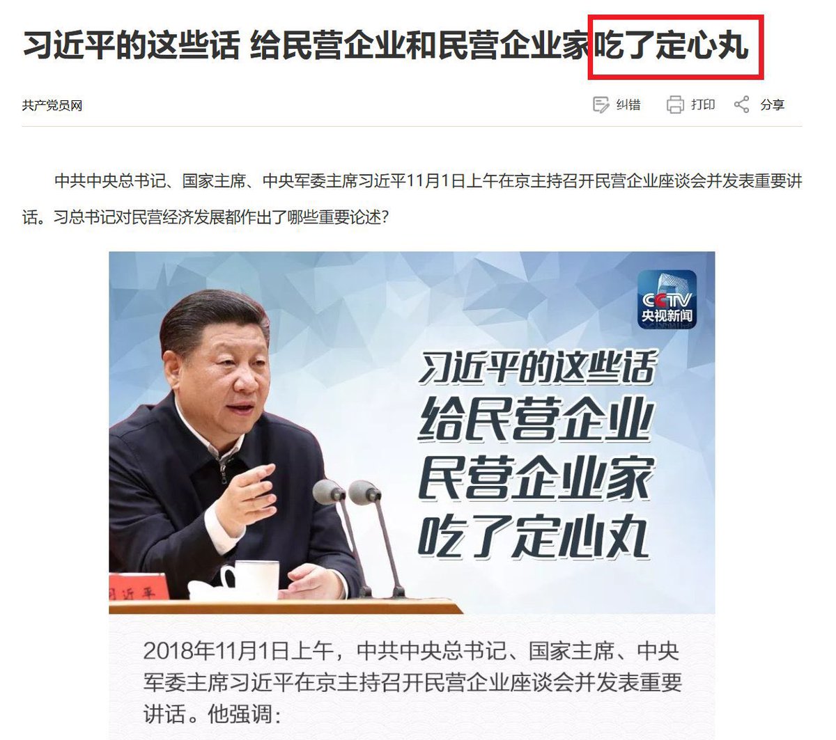 定心丸又吃了一遍,在习主席治下,民营企业家就像是灵鹫宫的一帮喽啰,定期要服用三尸脑神丹。你说这些吃药的企业家,吃下定心丸后是觉得更安全了呢,还是愈发害怕,心里面把天山童姥的祖宗咒骂十八遍。