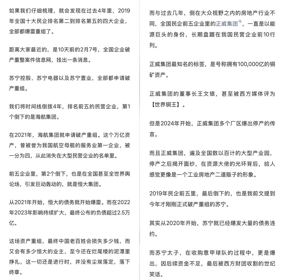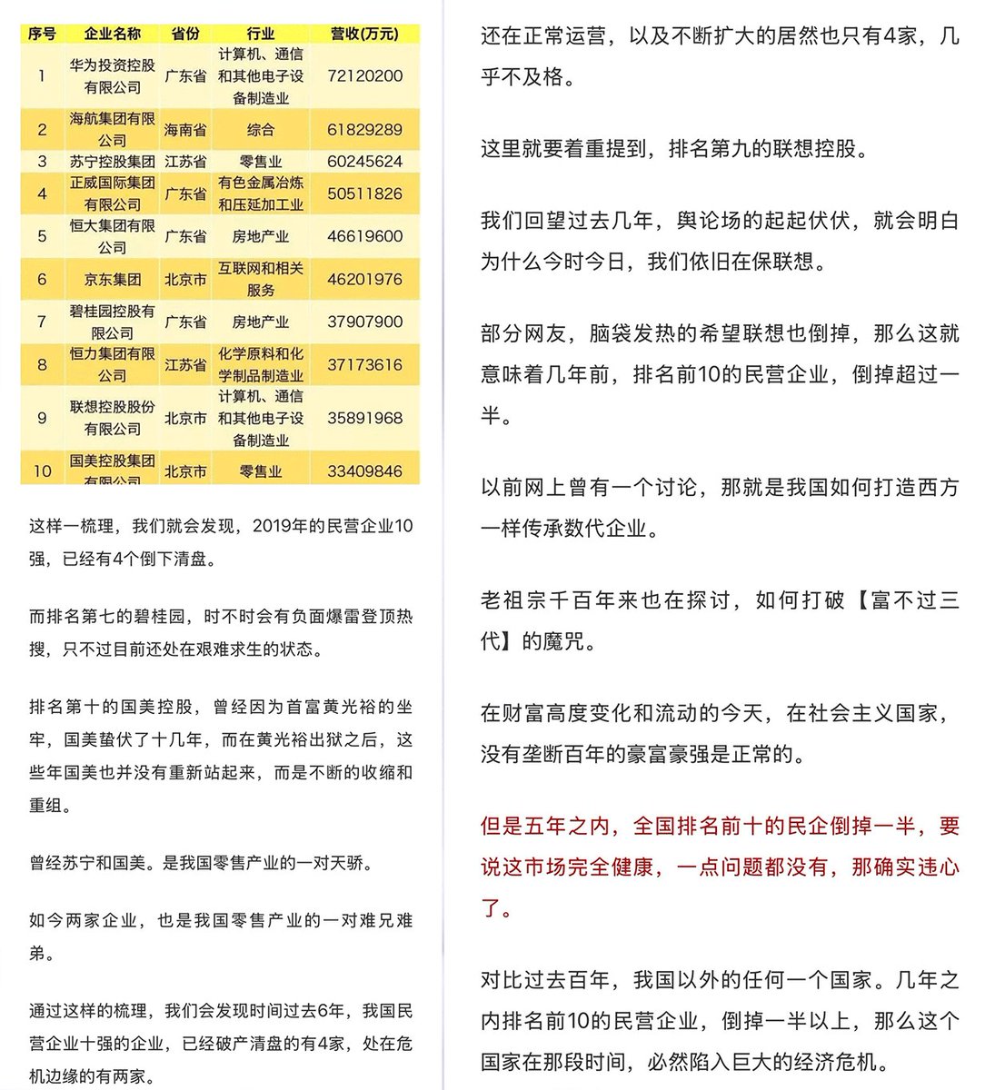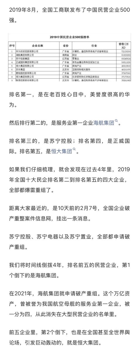 近日,习近平出席民企座谈会。博主“北风”通过梳理后发现,2019年中国公布民企500强,排名第二到第五的企业:苏宁控股、海航集团、恒大都陆续申请破产,正威集团在去年也传出多个厂区取停工停产。