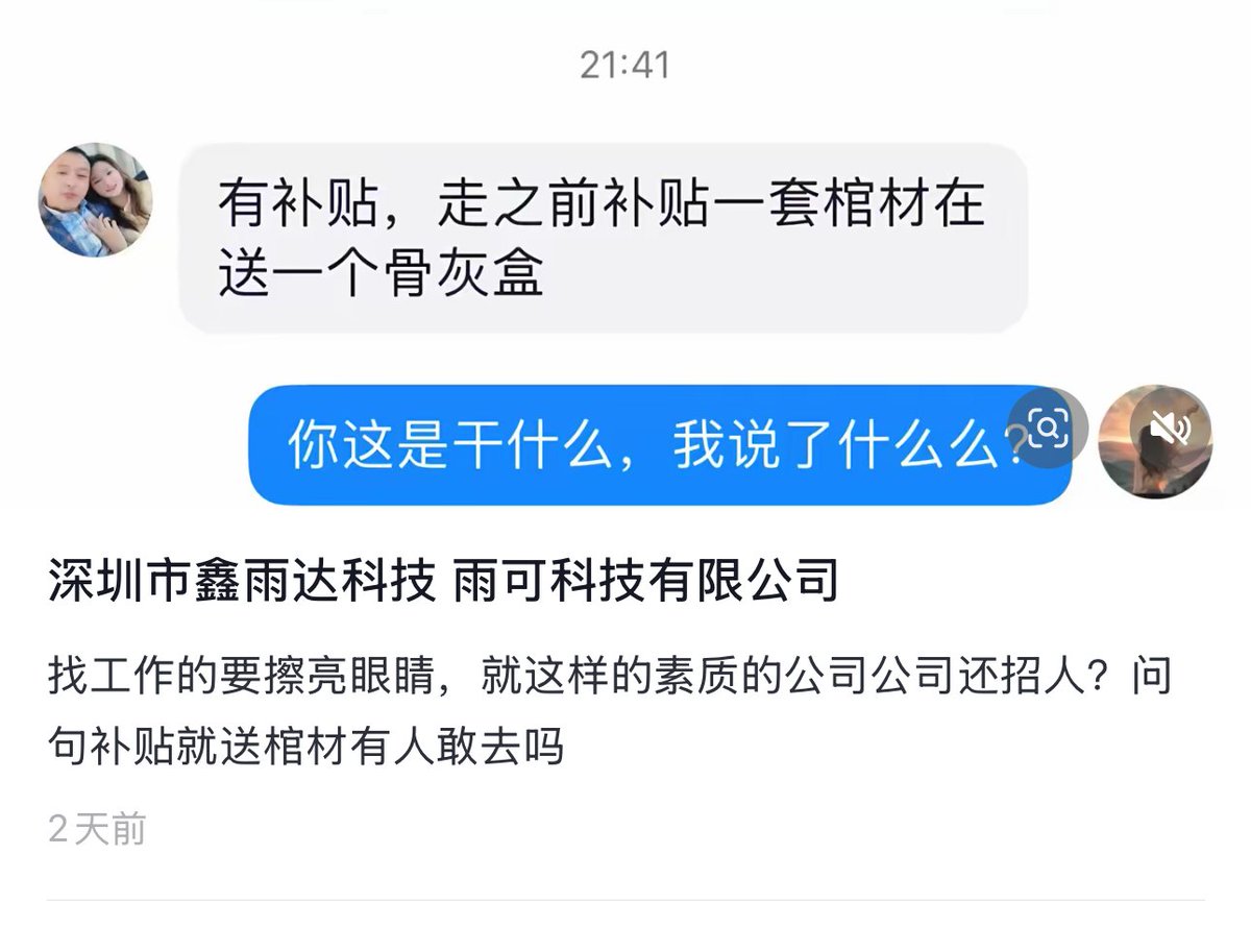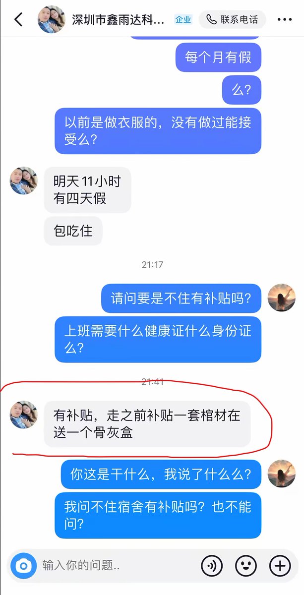 2月18日,广东深圳。网友询问一家工厂事人关于不住宿舍是否有补贴时,对方回复:“补贴一套棺材和骨灰盒” 网友称涉事企业名为:深圳市鑫雨达科技有限公司。