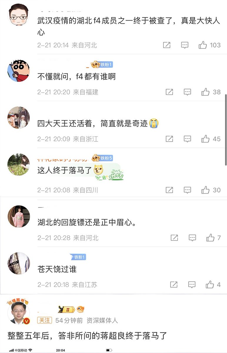 前湖北省委书记蒋超良被查。2020年初,武汉爆发疫情,湖北省和武汉市两级的政党“一把手”因防控疫情不力被推上风口浪尖。 同年2月,蒋超良的省委书记职务被上海市长应勇取代。