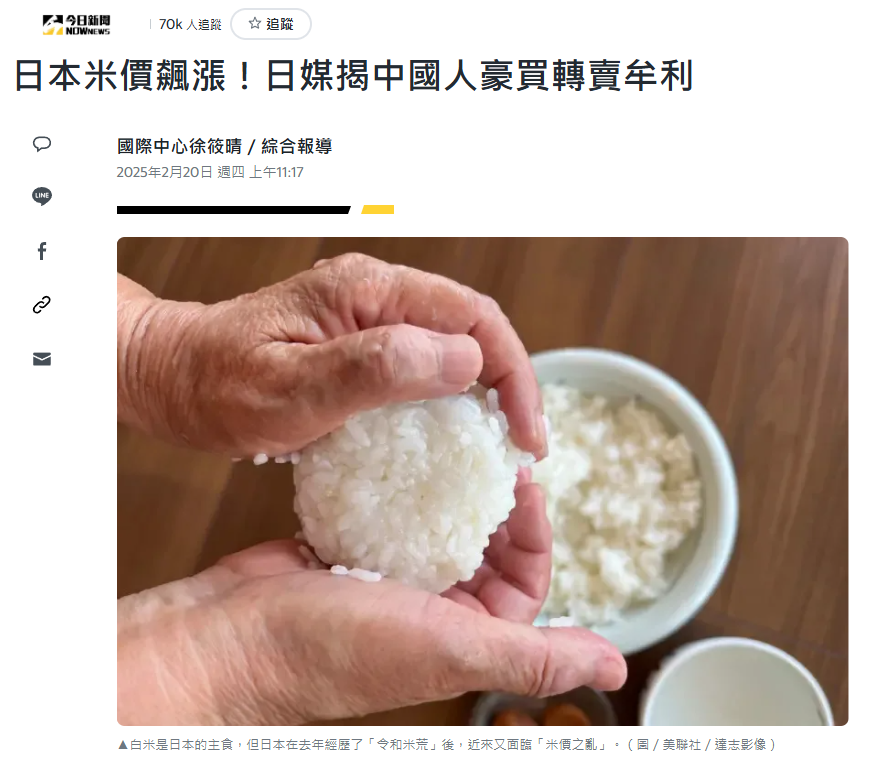 台媒 NOWnews:日本近期米价高涨,价格创下自06年来最高水准。据日媒报道,其原因之一被指是有在日中国人向农家大量收购稻米,乘机转卖图利。日本当局已为此释出21万吨「储备米」进入市场,以稳定供应、抑制价格。 日本大米的主要流通渠道是通过农协从粮农手中收购大米,然后批发给中小批发商,再通过超市等卖给消费者。 但媒体报道有中国人越过农协、直接从粮农手中大量收购大米,开出「有多少就买多少」的条件,然后在唐人街高价转卖。