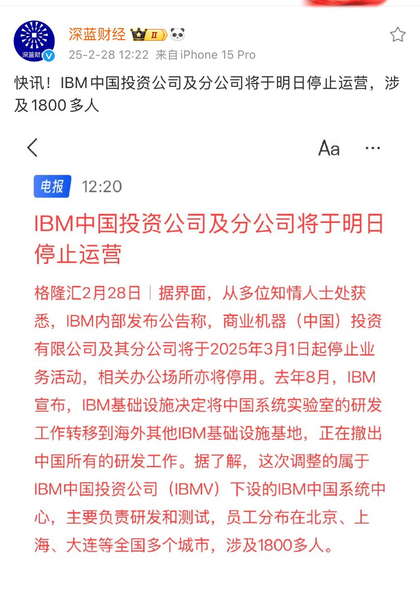 2月28日消息,据报 IBM 中国投资公司及分公司将于明日停止运营,涉及1800多人。