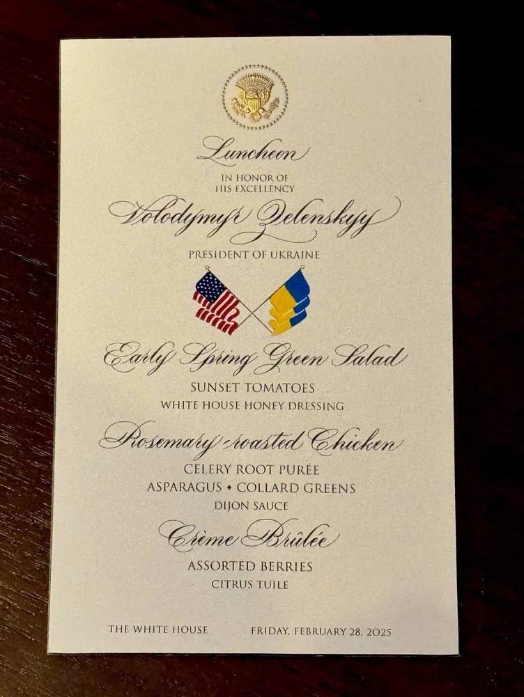 白宮新聞秘書稱,特朗普與澤倫斯基爭吵後吃了為澤倫斯基準備的午餐菜單包括番茄沙拉、迷迭香烤雞和焦糖布丁。
