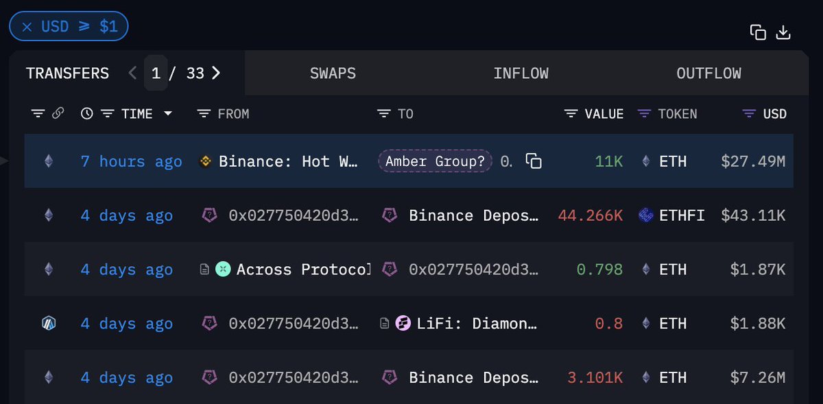 Amber Group 疑似在上涨趋势中建仓 11,000 枚 $ETH ,价值 2749 万美金🧐受特朗普「喊单」影响,ETH 一晚上上涨近 400 刀,现价 $2437;Amber 于七小时前提出该部分代币,提出价格 $2499,但实际买入点位可能更低一些钱包地址