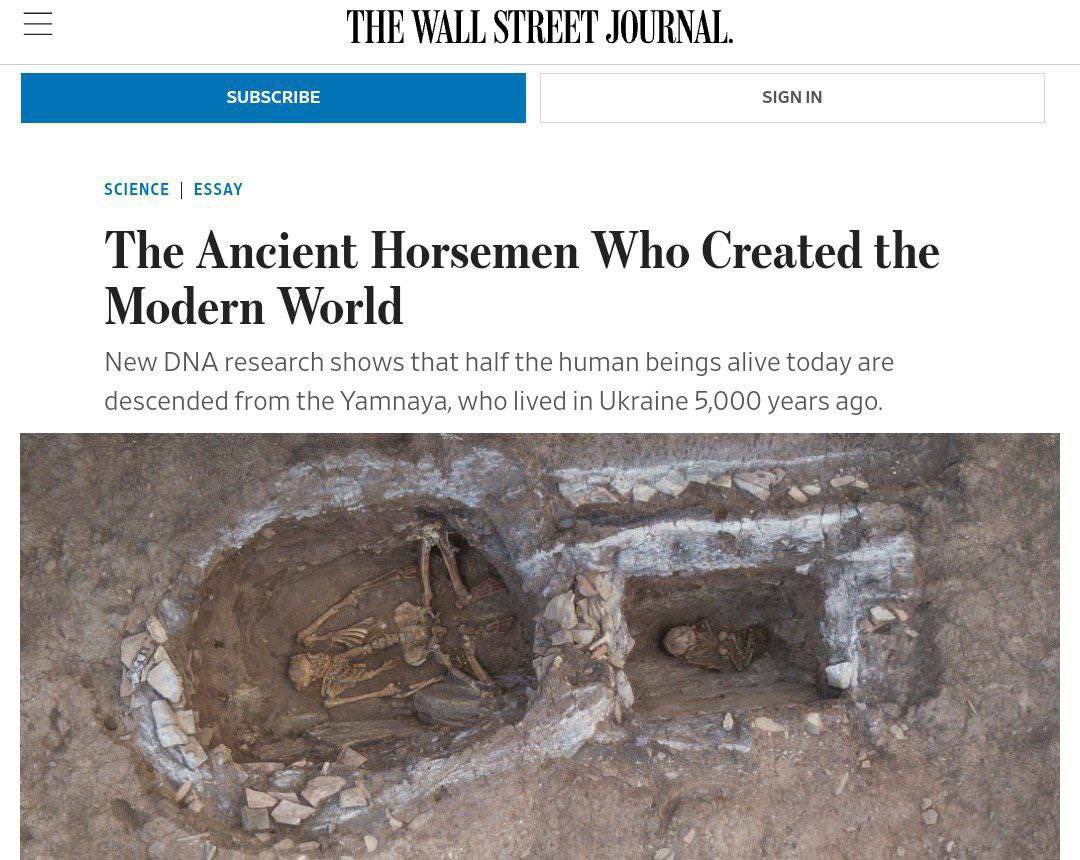 地球一半人口的祖先是烏克蘭的古老文化—《華爾街日報》DNA研究結果顯示,50%的人類可能源自5000年前存在於烏克蘭的顏那亞文化。