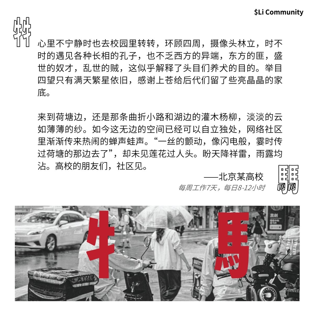 北京某高校每周工作7天的员工投稿:心里不宁静时也去校园里转转,环顾四周,摄像头林立,时不时的遇见各种长相的孔子,也不乏西方的异端,东方的匪,盛世的奴才,乱世的贼,这似乎解释了头目们养犬的目的。举目四望只有满天繁星依旧,感谢上苍给后代们留了些亮晶晶的家底。
