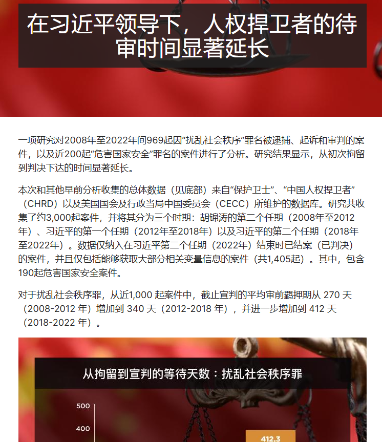 研究结果显示,在“扰乱社会秩序”罪名相关案件中,审前羁押的平均时长从胡锦涛任期的270天,增加到习近平第一任期的340天;并在习近平第二任期进一步增至412天。
