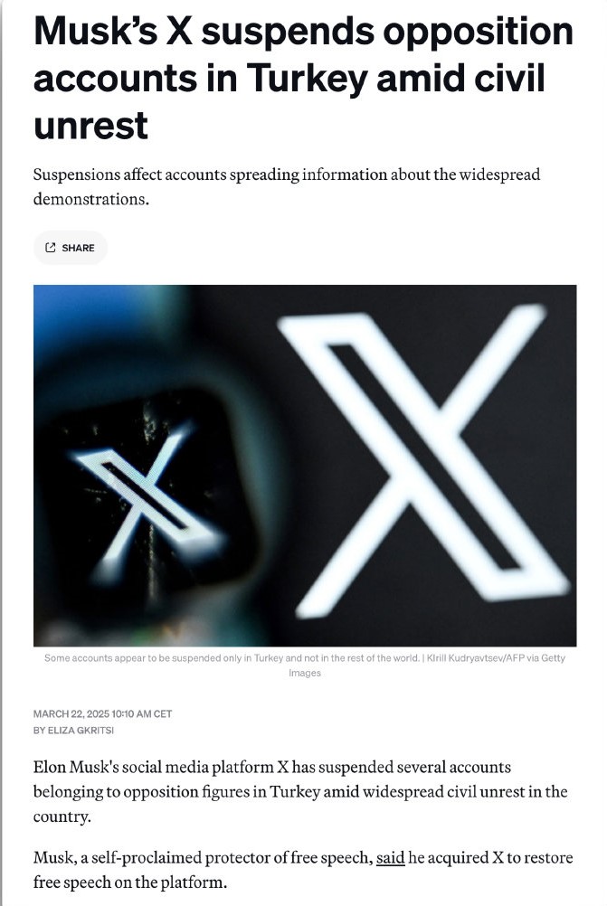 在土耳其爆发大规模民众抗议期间,马斯克的平台 X 暂停了土耳其反对派人士的多个帐号。
