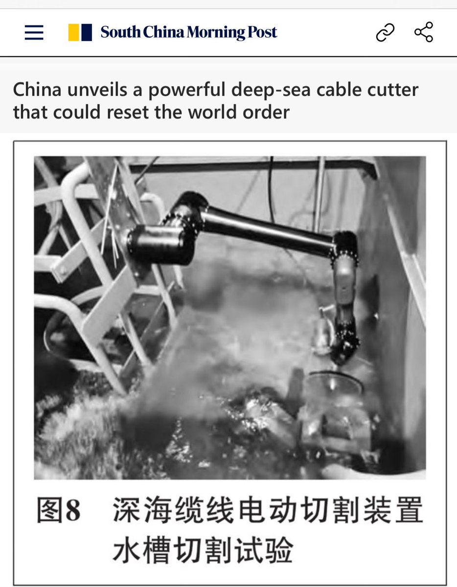 🚨 China is not even hiding it any more… the country has unveiled a compact, deep-sea, cable-cutting device, capable of severing the world's most fortified underwater communication or power lines at depths of up to 4,000m — twice the maximum operational range of existing subsea