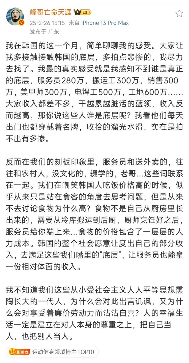 峰哥:在韩国一个月,想拍点底层,但他们收入都好高。