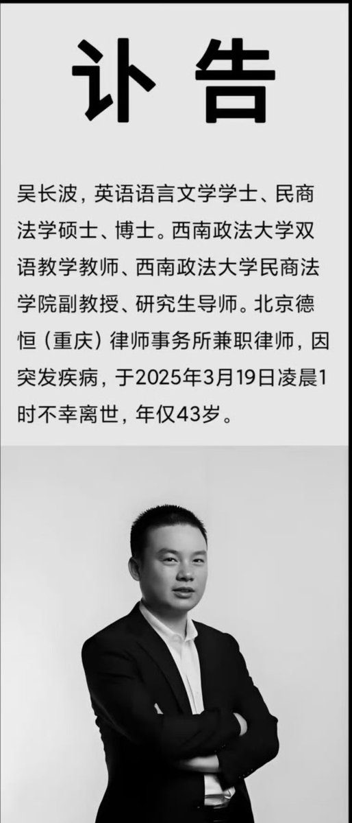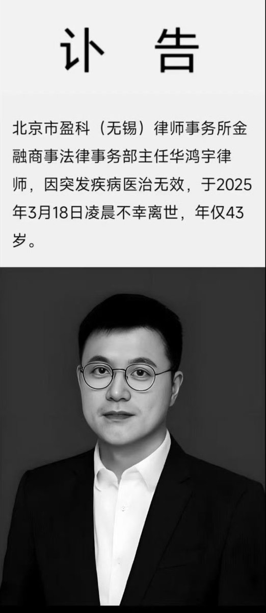 据不完全统计,2月末至今天发文已有5位年轻律师相继去世,去世年龄在31岁-35岁。 此前有公众号披露,今年1-2月已经有11名律师相继离世(不完全统计)