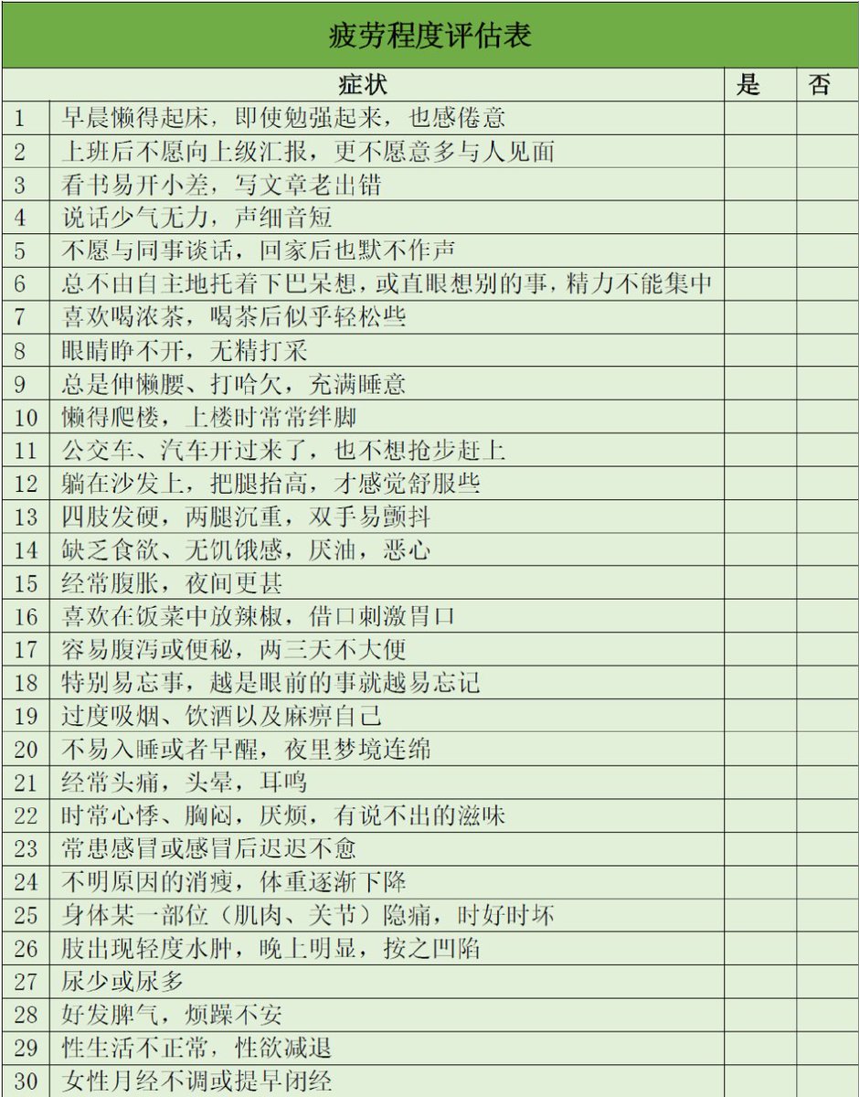 自测你的疲劳指数在以上30项中若有2~3项,表示轻度疲劳;若有4~5项,表示中度疲劳;若有6~8项,表示重度疲劳并提示有潜在疾病;若有9~10项或以上,可能已经患了慢性疲劳综合征。
