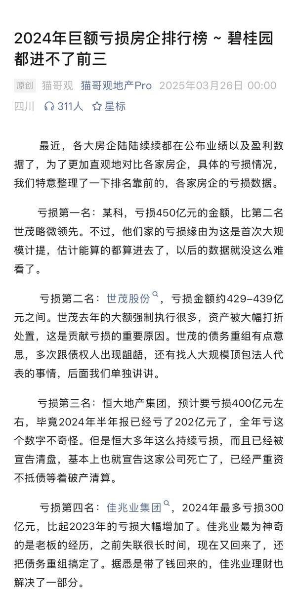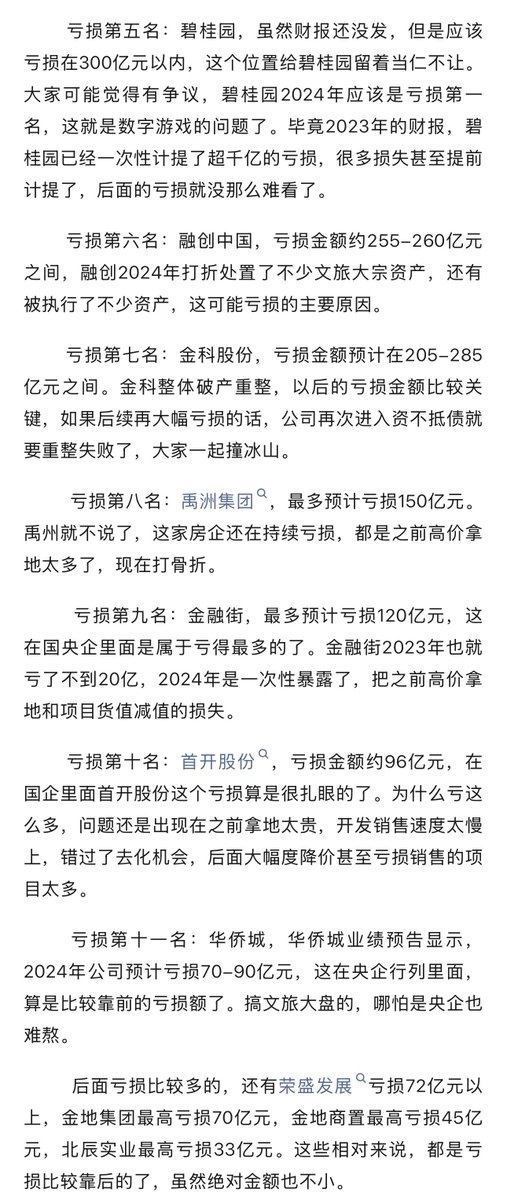 近期,中国多家房企发布去年业绩报告,中国超六成房企去年亏损。 截至3月中旬,A股和港股房地产开发企业,有90家已披露业绩预告,已有69家宣告亏损。 亏损第一名万科:亏损450亿;第二名世茂集股份:亏损429-439亿元之间;亏损第三名恒大地产集团:预计要亏损400亿左右。